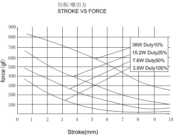 二、U0837L推拉式電磁鐵的行程和力量曲線圖: